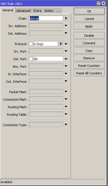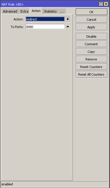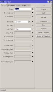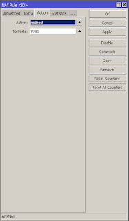 - Selanjutnya masuk ke menu IP >> Firewall >> NAT >> Add >> chain (dstnat) >> protocol ( 6(tcp) ) >> dst.port (80) Action (redirect) >> to port (8080) >> OK