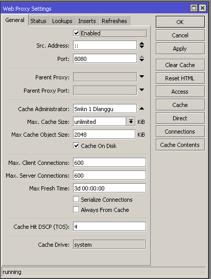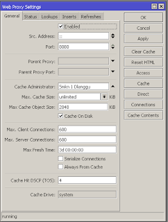 - Kemudian di menu web proxy ceklist >>enable dan ceklist >>cache on disk >>OK