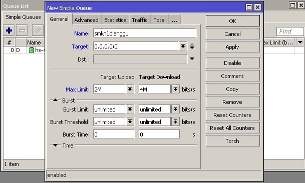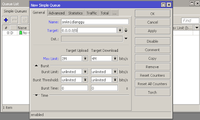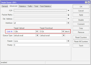 - Max LimitMax Limit adalah alokasi bandwidth maksimal yang bisa didapatkan user, dan biasanya akan didapatkan user jika ada alokasi bandwidth yang tidak digunakan lagi oleh user lain. Jangan lupa centang Target Upload dan Target Download untuk mengaktifkan fitur ini, pilih besar Bandwidth yang ingin dilimit pada Max Limit. Misalnya upload : 2Mbps download : 4Mbps.Besar limit Bandwidth untuk upload lebih rendah daripada download nya karena memang user biasanya lebih banyak melakukan download (browsing, download musik, file, dll) daripada upload. Anda dapat memilih sesuai keinginan.