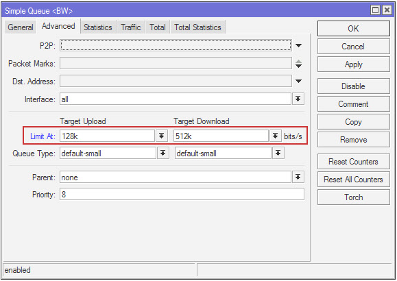 - Limit AtLimit At adalah alokasi bandwidth trendah yang bisa didapatkan oleh user jika traffic jaringan sangat sibuk. Seburuk apapun keadaan jaringan, user tidak akan mendapat alokasi bandwidth dibawah nilai Limit At ini. Jadi Limit At ini adalah nilai bandwidth terendah yang akan didapatkan oleh user. Nilai nya terserah anda mau diisi berapa. Misalnya diisi upload 128kbps download : 512kbps.