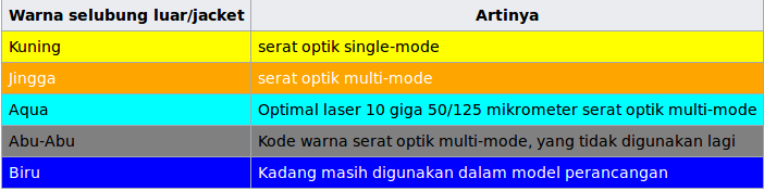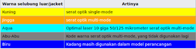- Dalam standarisasinya kode warna dari selubung luar (jacket) kabel serat optik jenis Patch Cord adalah sebagai berikut:
