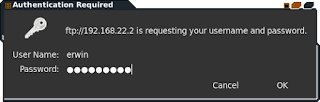 - Buka di browser dengan alamat ftp://ipaddressanda , maka akan muncul login, isikan sesuai dengan yang telah di konfigurasi tadi , untuk passwordnya sama seperti password user yang telah di konfigurasi tadi