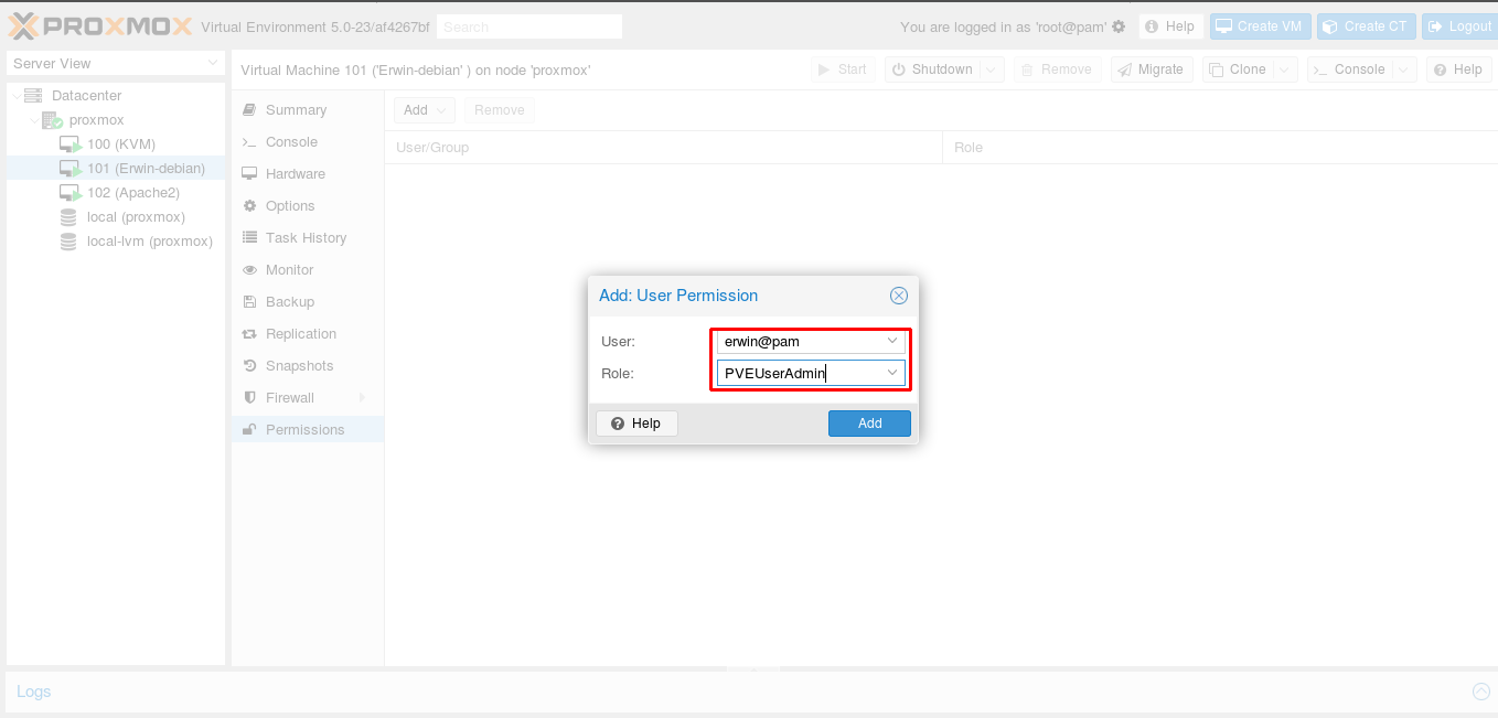 - Karena Pengguna VM Saya Di proxmox banyak , dan setiap user akan masuk di proxmox dengan user "root" , maka saya menggunakan management user agar setiap user masuk di proxmox dengan usernya sendiri dan vm yang di akses hanya vm-nya sendiri