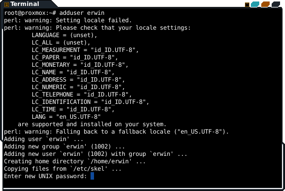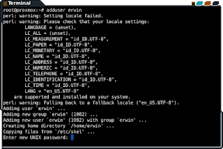 - Remote proxmox dengan ssh , jika sudah masuk maka buat user baru dengan perintah adduser userbaru