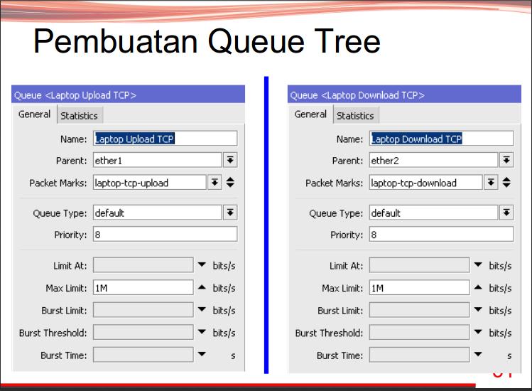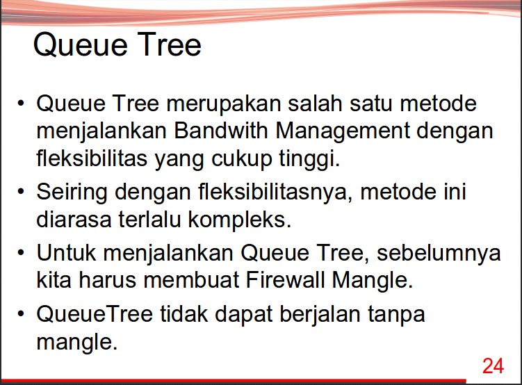 - Jika menggunakan Queue Simple dan Queue Tree secara bersama-sama, Queue Simple akan diproses lebih dulu dibandingkan Queue Tree.
