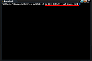 - Selanjutnya copy 000-default.conf ke indra.conf , dengan perintah cp 000-default.conf indra.conf