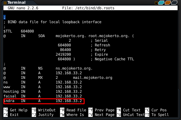 - edit db.roots , dengan perintah nano /etc/bind/db.roots