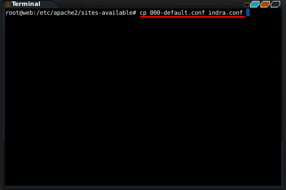 - Selanjutnya copy 000-default.conf ke indra.conf , dengan perintah cp 000-default.conf indra.conf