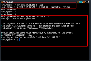 - Sekarang coba remote server lagi menggunakan perintah yang sebelumnya , pasti akan muncul port 22 Connection refused , berarti port sudah berhasil di ganti , dan coba menggunakan perintah seperti di gambar , hanya tinggal di tambah " -p portnya"