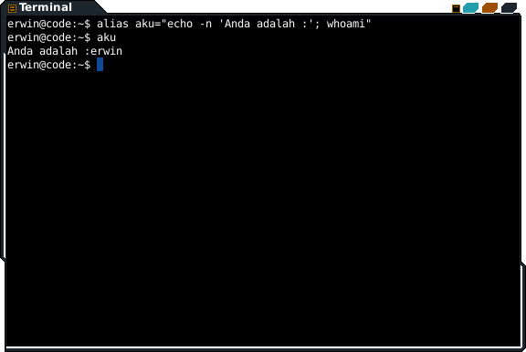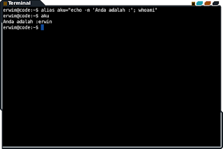 alias aku="echo -n 'Anda Adalah :'; whoami" - Tapi Di atas hanya untuk Sementara , jika mesin mati dan di hidupkan lagi maka tidak akan bekerja , supaya bekerja terus maka di simpan di dalam .bashrc , karena setiap membuka terminal semua perintah yang di .bashrc di eksekusi otomatis , Tambah kan seperti Berikut