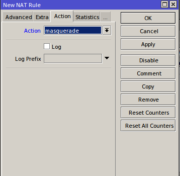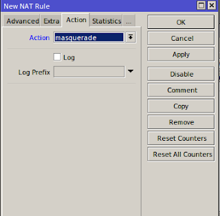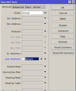 - Selanjutnya Masuk ke NAT untuk Membuat rule-nya, IP>>Firewall>>NAT>>Add>>chain (srcnat)>>out interface(eth1)>>action(musquerade)