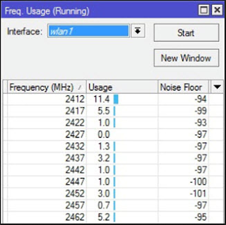 - Frequency Usage Tool MikrotikTool ini berfungsi untuk melakukan scanning penggunaan frekuensi disekitar perangkat mikrotik anda. Frequency Usage akan menampilkan beban penggunaan masing-masing frekuensi apakah banyak digunakan apa sepi pengguna. Sehingga kita dapat menentukan frekuensi mana yang tidak terlalu ramai penggunanya untuk mengurangi interferensi.