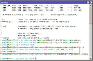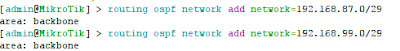d. Kemudian kita masukan ip network kita di routing ospf kita, dengan masukan perintah : routing ospf network add network={ip network }, area=backbone.