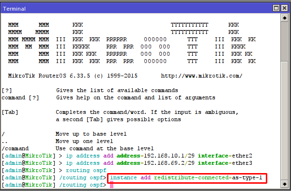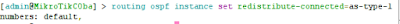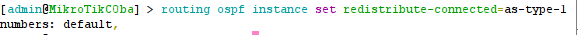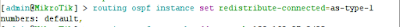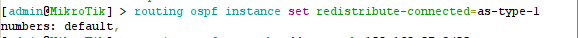 c. Selanjutnya kita lakukan proses konfigurasi routingnya, dengan memasukan perintah : routing ospf instance set redistribute-connected=as-type-1. numbers=default.