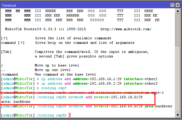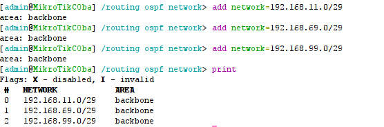 d. Kemudian kita masukan ip network kita di routing ospf kita, dengan masukan perintah : routing ospf network add network={ip network }, area=backbone.