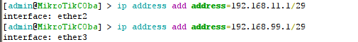 b. Jika menggunakan CLI maka lakukan perintah berikut : ip address add address={ipnya} interface={ethernetnya}. Seperti pada gambar di bawah ini.