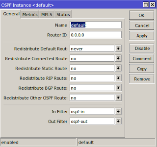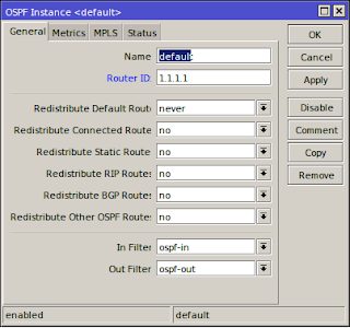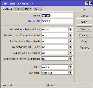 - Kemudian menambah instance Routing ospf pada router id Routing>>OSPF>>OSPF Fnstance>>General