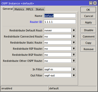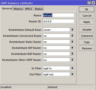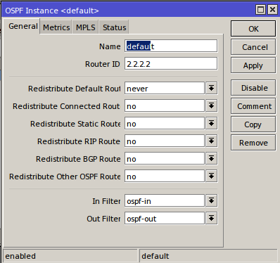 - Kemudian menambah instance Routing ospf pada router id Routing>>OSPF>>OSPF Fnstance>>General