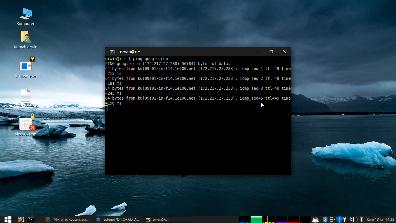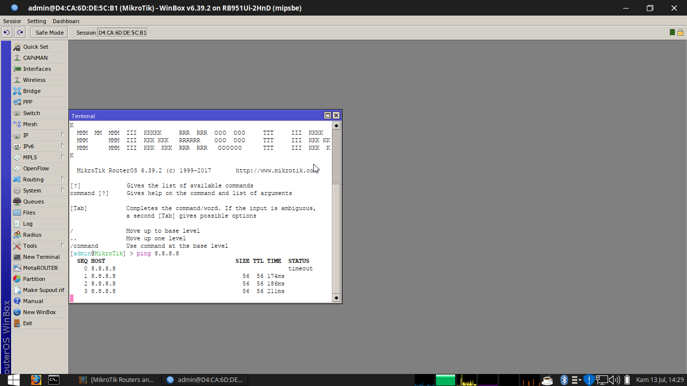 - Selanjutnya buka terminal pada winbox & ping 8.8.8.8 , untuk cek apakah mikrotik sudah terhubung dengan iternet atau belum