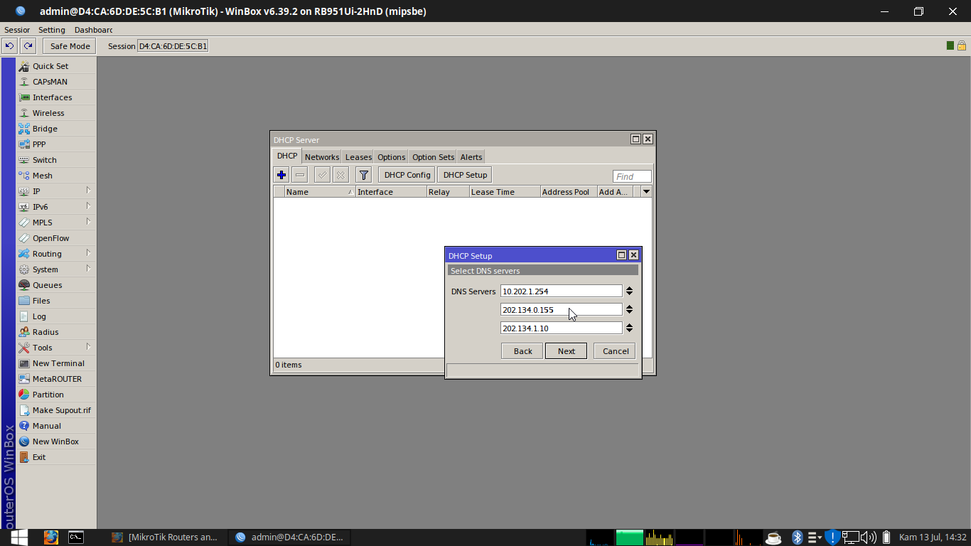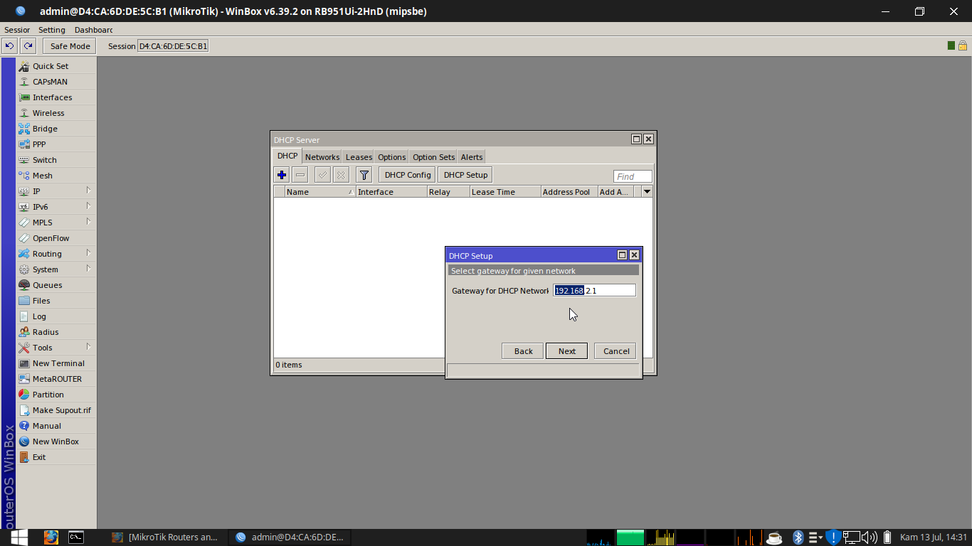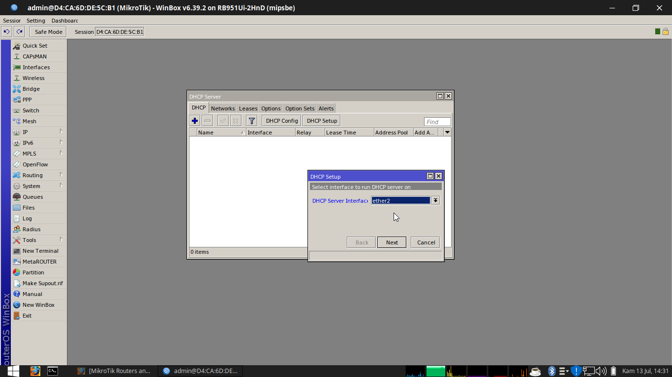 - Sekarang Lanjut pada Dhcp Server IP >> DHCP SERVER >> DHCP SETUP pilih iterface yang ether2 . Klik Next Klik Next , Dan Yang Selanjutnya Sesuaikan Sendiri