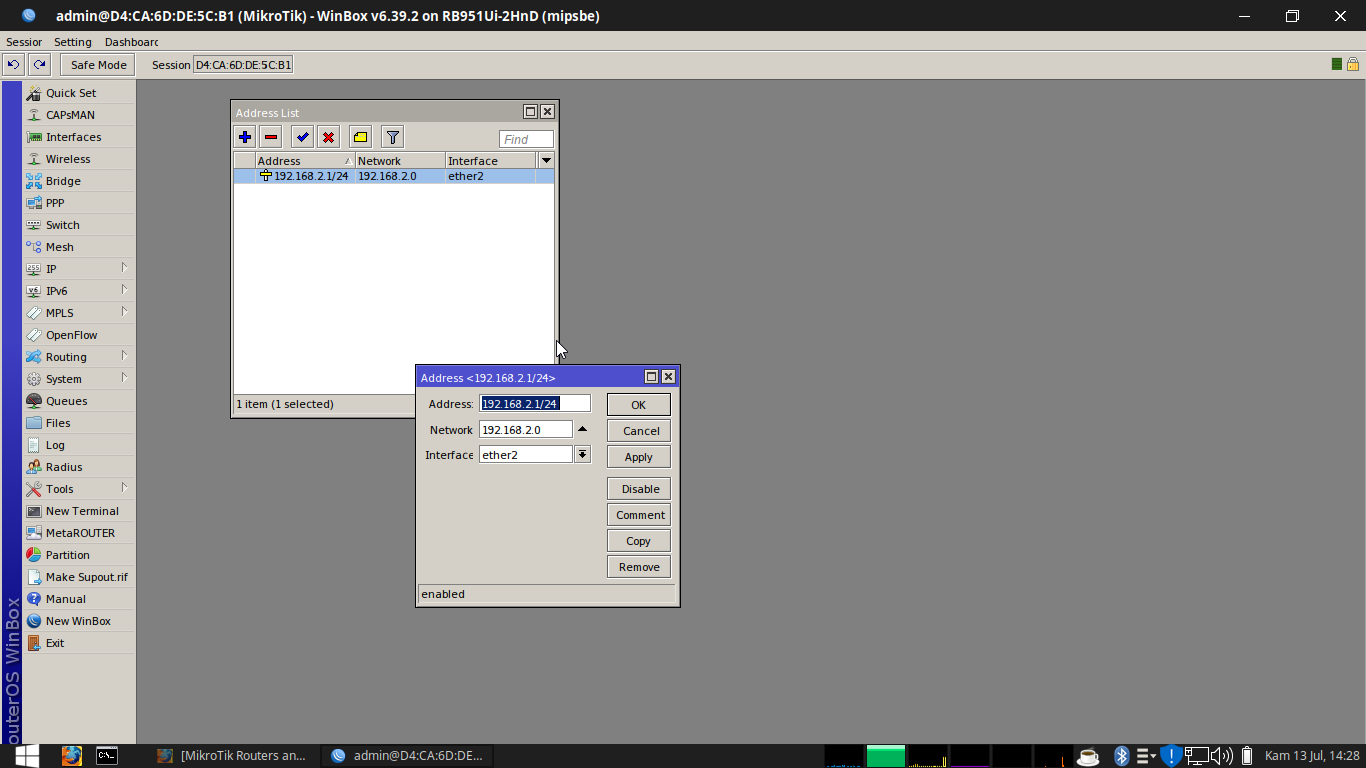 - kasih Ip pada ether2 IP >> Adresses >> (+) Interface = ether2 ip = 192.168.2.1/24 lalu apply & ok