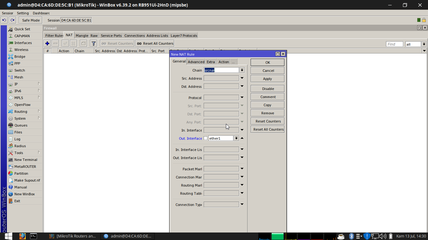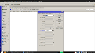 - Sekarang menghubungkan internet ke laptop , dari mikrotiknya . Buka IP >> FIREWALL >> (NAT) >> (+) setting chain = srcnat dan action = masquerade . Klik apply & Ok