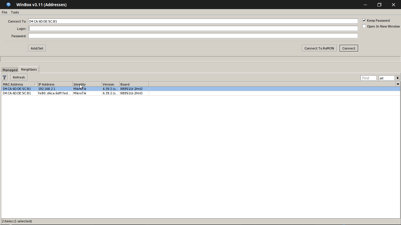 - buka winbox , klik pada neighbors , refresh jika sudah muncul masuk menggunakan mac address user = admin password = (kosonginaja)