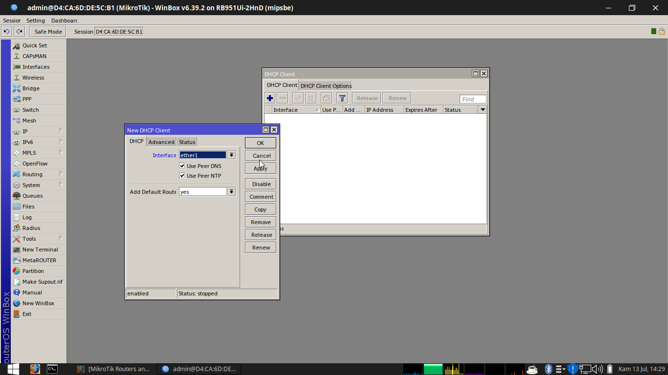 - Setting dhcp client IP >> DHCP CLIENT >> (+) . buat baru , pada interface isikan ether1 klik apply & ok